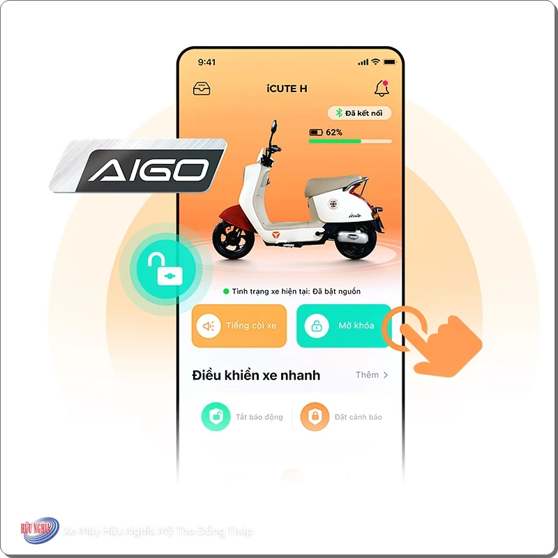 Nhưng đừng để vẻ ngoài “cute” đánh lừa bạn, bởi bên trong YADEA iCUTE H là cả một hệ sinh thái công nghệ hiện đại đến từ YADEA. Điểm nổi bật nhất chính là nền tảng thông minh AIGO AIR – cho phép người dùng kết nối xe với điện thoại, mở khóa từ xa, tìm xe qua Bluetooth và quản lý xe một cách tiện lợi. Không cần chìa khóa truyền thống, không lo quên chìa hay mất chìa – tất cả giờ đây chỉ gói gọn trong một chiếc smartphone.